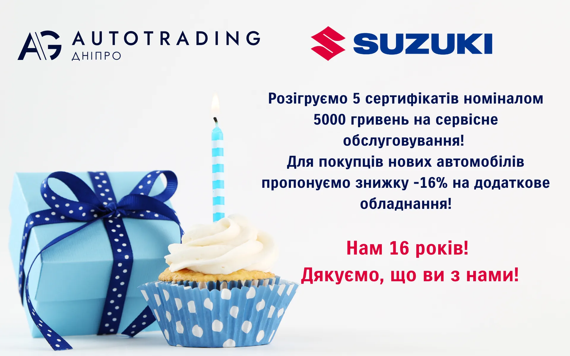 11 березня 2026 року компанія «Автотрейдінг-Дніпро», офіційний дилер SUZUKI в Дніпропетровській області, святкує 16 років успішної роботи!